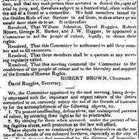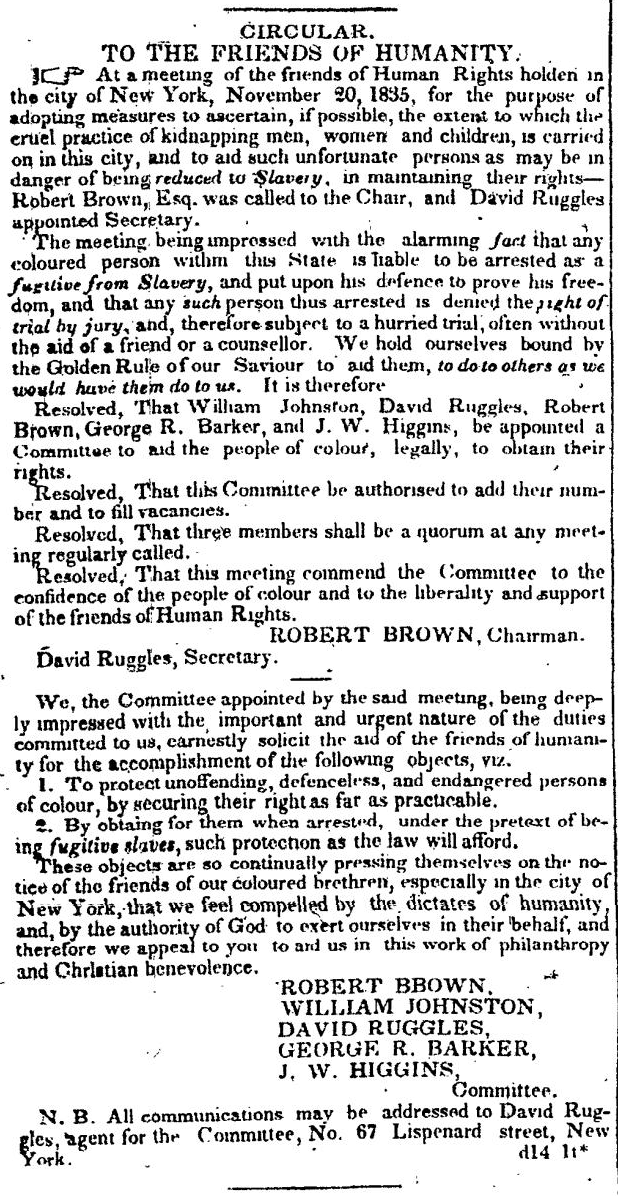 At a meeting of the friends of Human Rights holden in the city of New York, November 20, 1835, for the purpose of adopting measures to ascertain, if possible, the extent to which the cruel practice of kidnapping men, women and children, is carried on in this city, and to aid such unfortunate persons as may be in danger of being reduced to Slavery, in maintaining their rights—Robert Brown, Esq. was called to the Chair, and David Ruggles appointed Secretary.