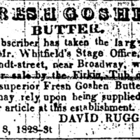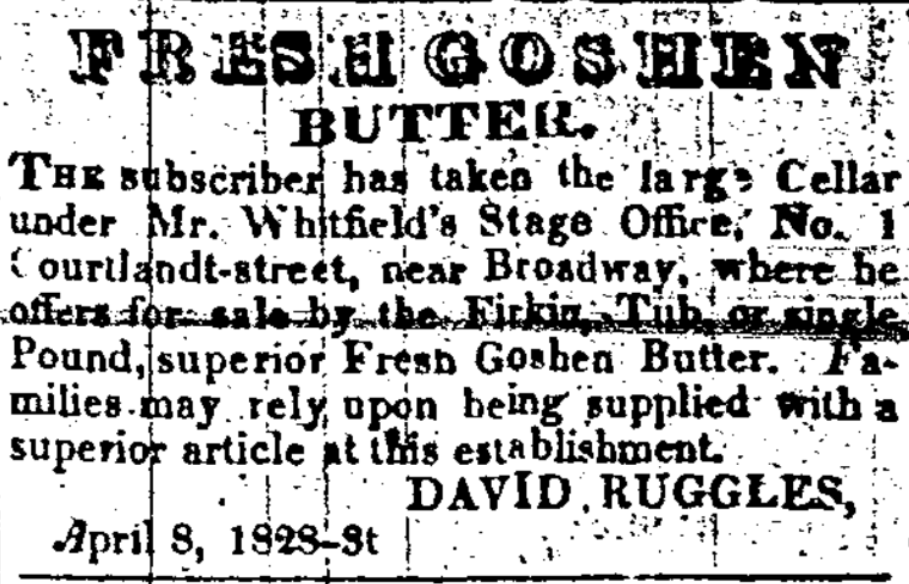 The subscriber has taken the large Cellar under Mr. Whitfield's Stage Office, No. 1 Courtlandt-street, near Broadway, where he offers for sale by the Firkin, Tub, or single Pound, superior Fresh Goshen Butter. Families may rely upon being supplied with a superior article at this establishment.
