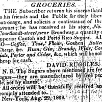 THE Subscriber returns his sincere thanks to his friends and the Public for their liberal patronage, and solicits a continuance of their favours; he has received at his store, No. 1 Courtlandt-street, near Broadway, a quantity of superior Canton and Porto Rico Sugars. ALSO—Coffee, Teas, Flour, Goshen, Butler, Cheese, &c. Rum, Gin, Brandy, Wine, Cordials, Porter and Cider, &c. which will be sold cheap for cash.
