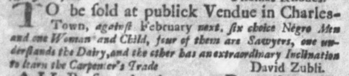 TO be sold at publick Vendue in Charles-Town, against February next, six choice Negro Men and one Woman and Child, four of them are Sawyers, one understands the Dairy, and the other has an extraordinary Inclination to learn the Carpenter's Trade David Zubli.