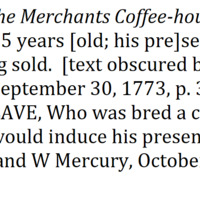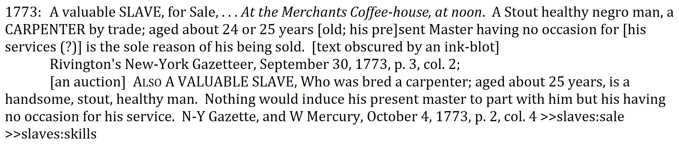 A valuable SLAVE, for Sale, ... At the Merchants Coffee-house, at noon. A Stout healthy negro man, a CARPENTER by trade; aged about 24 or 25 years [old; his pre]sent Master having no occasion for [his services (?)] is the sole reason of his being sold.
