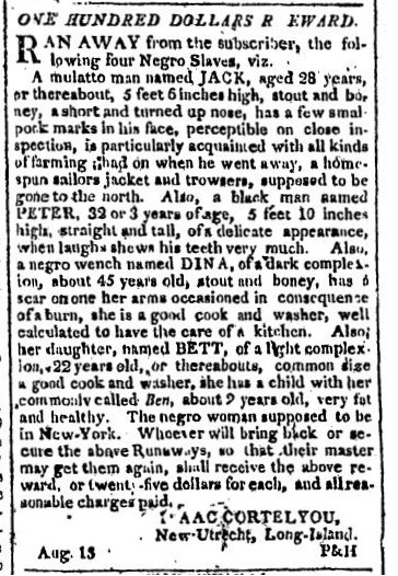 A mulatto man named JACK, aged 28 years or thereabout, 5 feet 6 inches high, stout and boney, a short and turned up nose, has a few smalpock marks in his face, perceptible on close inspection, is particularly acquinted with all kinds of farming; had on when he went away, a homespun sailors jacket and trowsers, supposed to be gone to the north. Also a black man named PETER, 32 or 3 years of age, 5 feet 10 inches high, straight and tall, of a delicate appearance, when laughs shows his teeth very much. Also, a negro wench named DINA, of a dark complexion, about 45 years old, stout and boney, has a scar on one her arms occasioned in consequence of a burn, she is a good cook and washer, well calculate to have the care of a kitchen. Also, her daughter, named Bett, of a light complexion, 22 years old, or theareabouts, common size, a good cook and washer, she has a child with her commonly called Ben, about 2 years old, very fat and healthy. The negro woman supposed to be in New-York. Whoever will bring back or secure the above Runaways, so that their mater may get them again, shall receive the above reward or twenty-five dollars for each, and all reasonable charges paid.