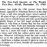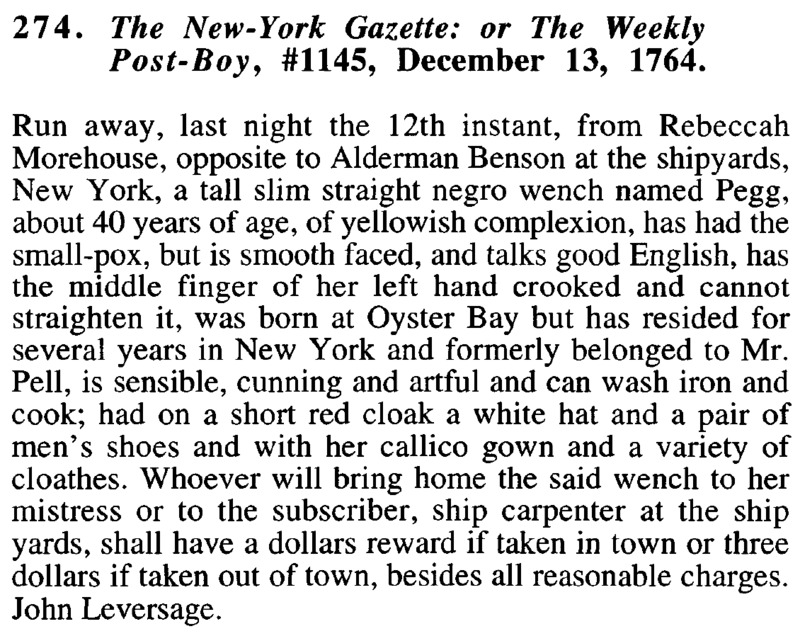 Run away, last night the 12th instant, from Rebeccah Morehouse, opposite to Alderman Benson at the shipyards, New York, a tall slim straight negro wench named Pegg, about 40 years of age, of yellowish complexion, has had the small-pox, but is smooth faced, and talks good English, has the middle finger of her left hand crooked and cannot straighten it, was born at Oyster Bay but has resided for several years in New York and formerly belonged to Mr. Pell, is sensible, cunning and artful and can wash iron and cook; had on a short red cloak a white hat and a pair of men’s shoes and with her callico gown and a variety of cloathes. Whoever will bring home the said wench to her mistress or to the subscriber, ship carpenter at the ship yards, shall have a dollars reward if taken in town or three dollars if taken out of town, besides all reasonable charges. John Leversage.