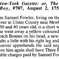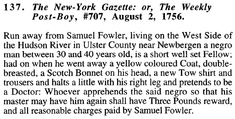 Run away from Samuel Fowler, living on the West Side of the Hudson River in Ulster County near Newbergen a negro man between 30 and 40 years old, is a short well set Fellow; had on when he went away a yellow coloured Coat, double-breasted, a Scotch Bonnet on his head, a new Tow shirt and trousers and halts a little with his right leg and pretends to be a Doctor: Whoever apprehends the said negro so that his master may have him again shall have Three Pounds reward, and all reasonable charges paid by Samuel Fowler.